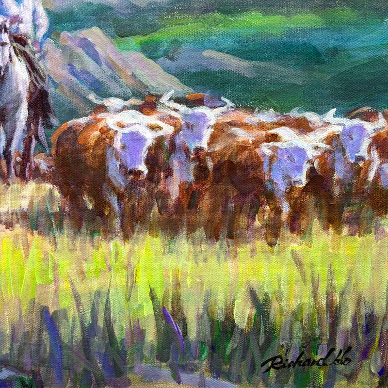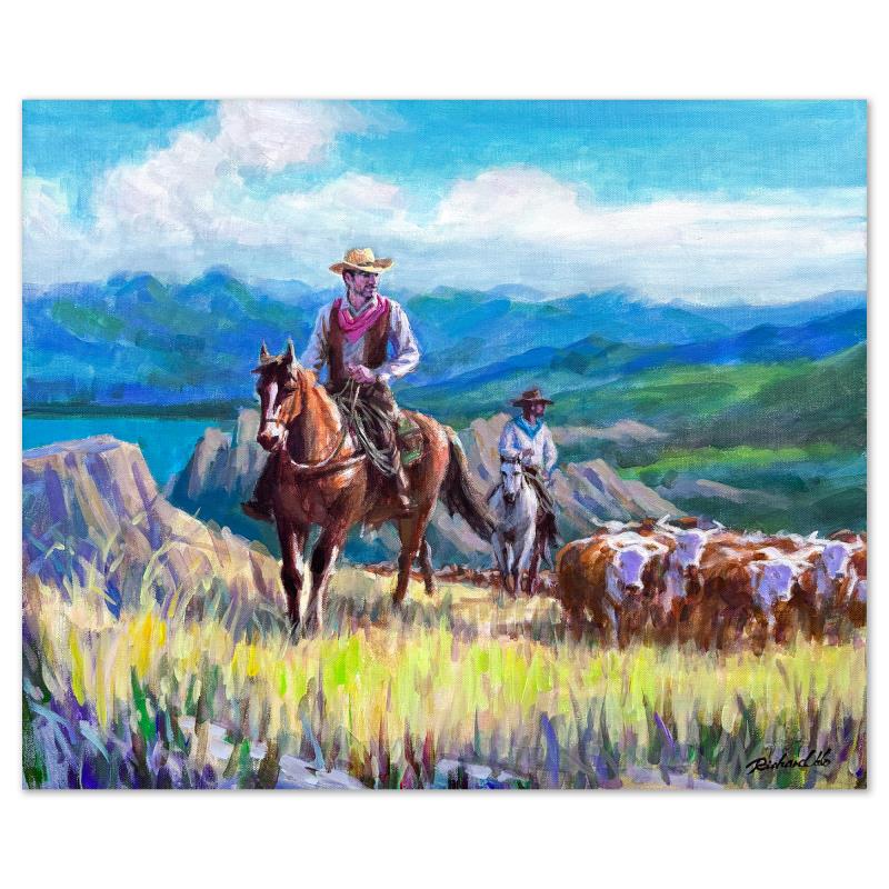 "To Greener Pastures" is an original acrylic painting on stretched canvas by Richard Ho, hand signed by the artist. Includes Letter of Authenticity. Measures approx. 20" x 24" (image).